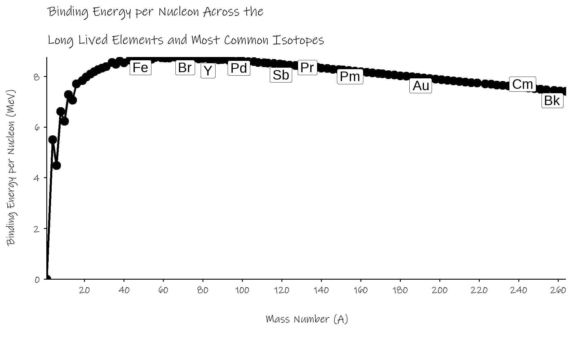 hits a maximum of ~8.75 MeV around 56Fe