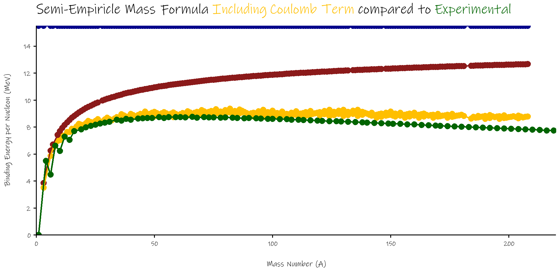 a negative Coulomb term depending on the number and separation of the protons. Given by \(-a_cZ(Z-1)A^{-\frac{1}{3}}\) (again, remember the radius)