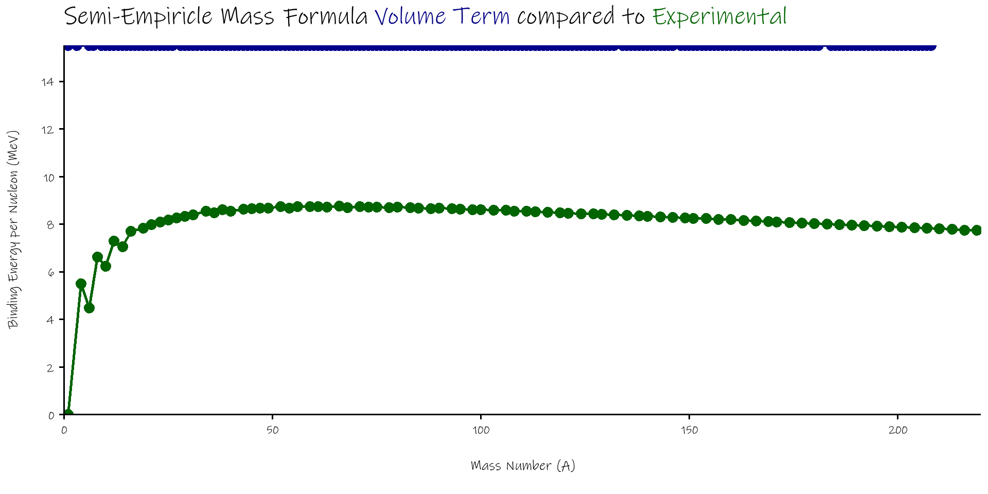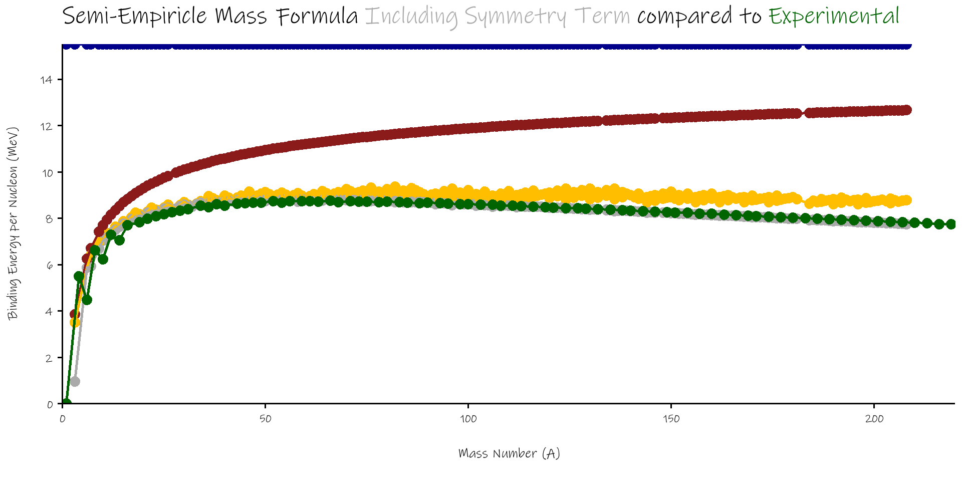 a negative symmetric term favouring equal numbers of protons and neutrons, especially for light nuclei. Given by \(-a_{sym}\frac{(A-2Z)^2}{A}\)