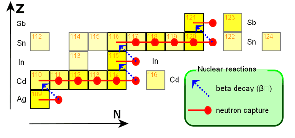 if neutron flux less, then \(\beta\) decays will happen moving element across periodic table (s process)