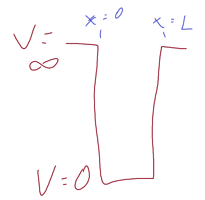 In our first application of the Schrödinger Equation, we’ll look at a particle in a 1 -dimensional box. This particle is at zero potential in the interval \(0 \leq x \leq a\) but cannot move outside these bounds.