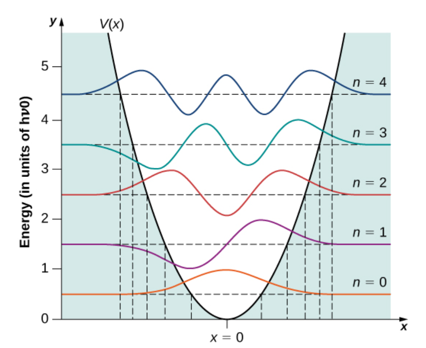 For the next application of the Schrödinger Equation, we’ll look at a particle undergoing simple harmonic motion (SHO). This particle is in a parabolic potential and classically exhibits the kind of motion typical of pendula or stretched springs. This is typical of vibrational modes in molecules.